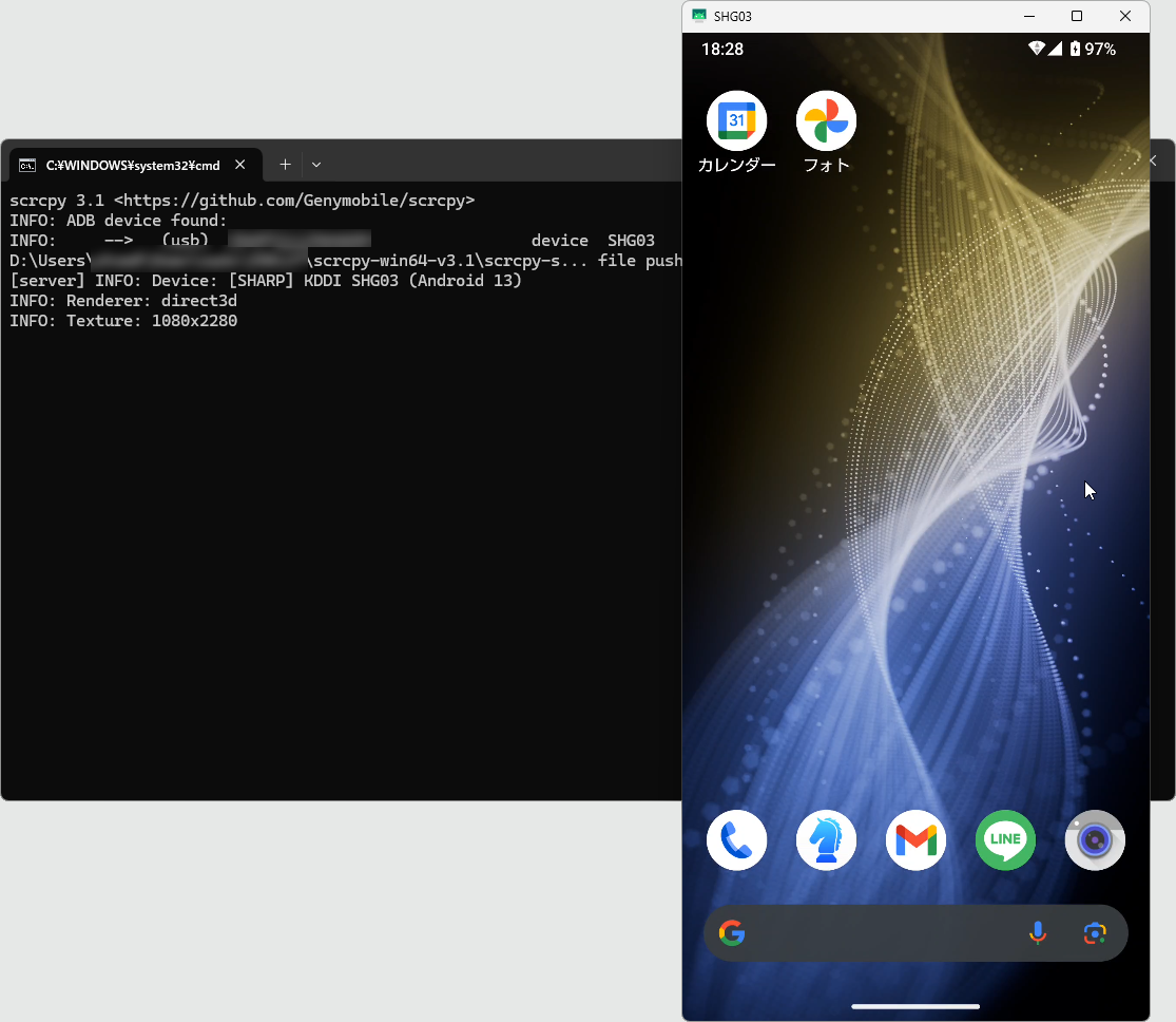 scrcpy.exeまたはscrcpy-console.batをダブルクリックする